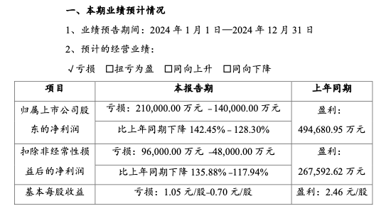 1月24日晚间,江西赣锋锂业集团股份有限公司(以下简称“赣锋锂业”或“公司”)发布2024年年度业绩预告。公司预计2024年度归母净利润将亏损21亿元至14亿元,较上年同期的盈利49.47亿元下降142.45%至128.3%。扣除非经常性损益后的净利润预计亏损9.6亿元至4.8亿元,相较于上年同期盈利26.76亿元,下降135.88%至117.94%。基本每股收益预计亏损1.05元/股-0.7元/股,而上年同期盈利2.46元/股。赣锋锂业于2010年上市,2010—2023年,公司均处于盈利状态,2024年净利预亏或致公司上市后年度净利首亏。