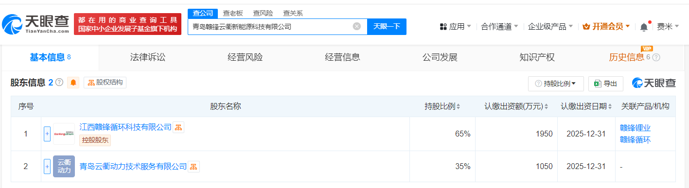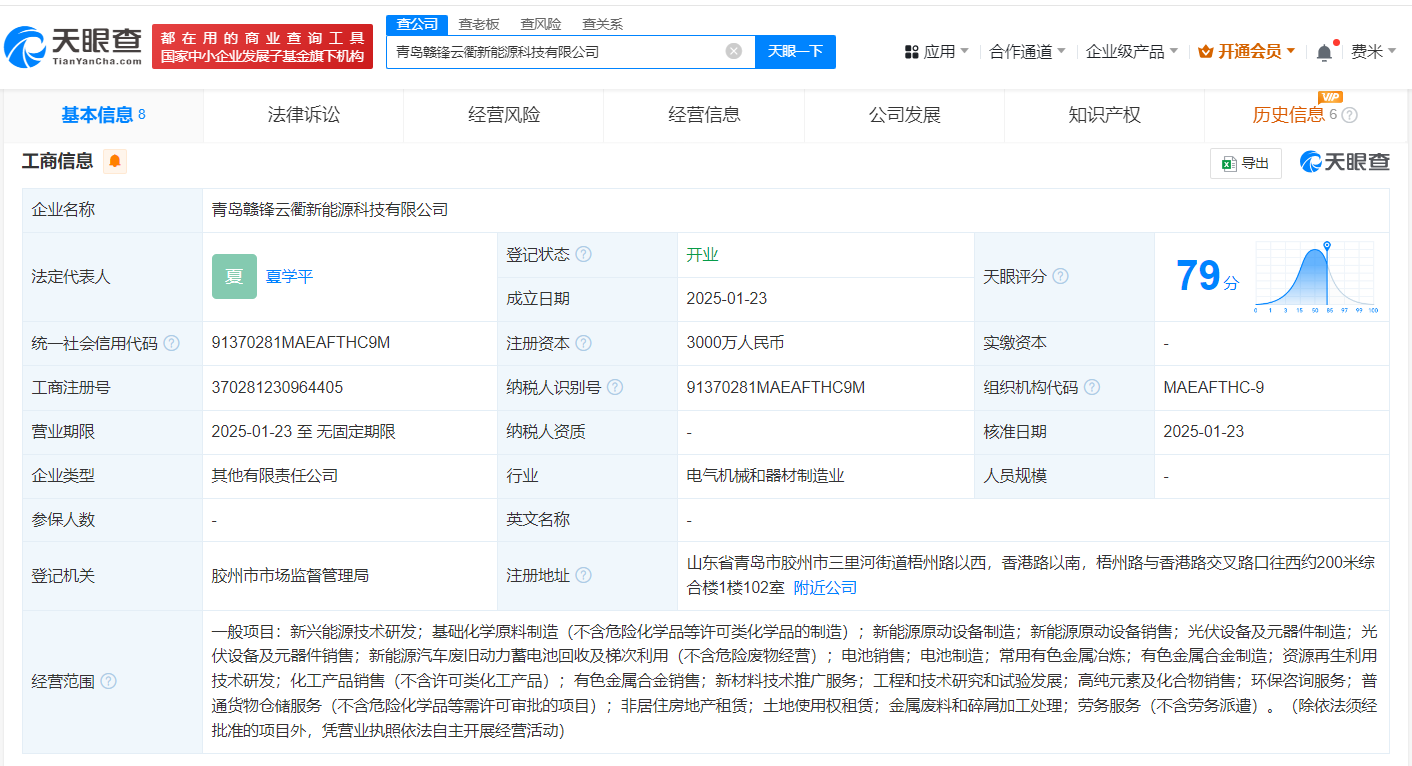 每经AI快讯,天眼查App显示,近日,青岛赣锋云衢新能源科技有限公司成立,法定代表人为夏学平,注册资本3000万元人民币,经营范围含新兴能源技术研发、新能源原动设备制造、新能源原动设备销售、光伏设备及元器件制造、光伏设备及元器件销售、电池销售等,由赣锋锂业(002460)旗下江西赣锋循环科技有限公司、青岛云衢动力技术服务有限公司共同持股。